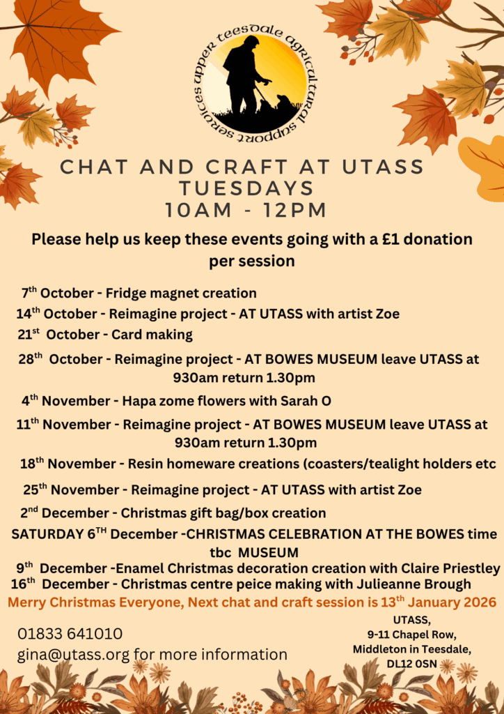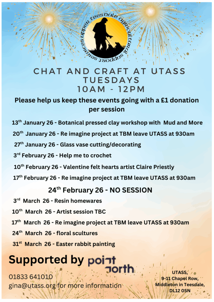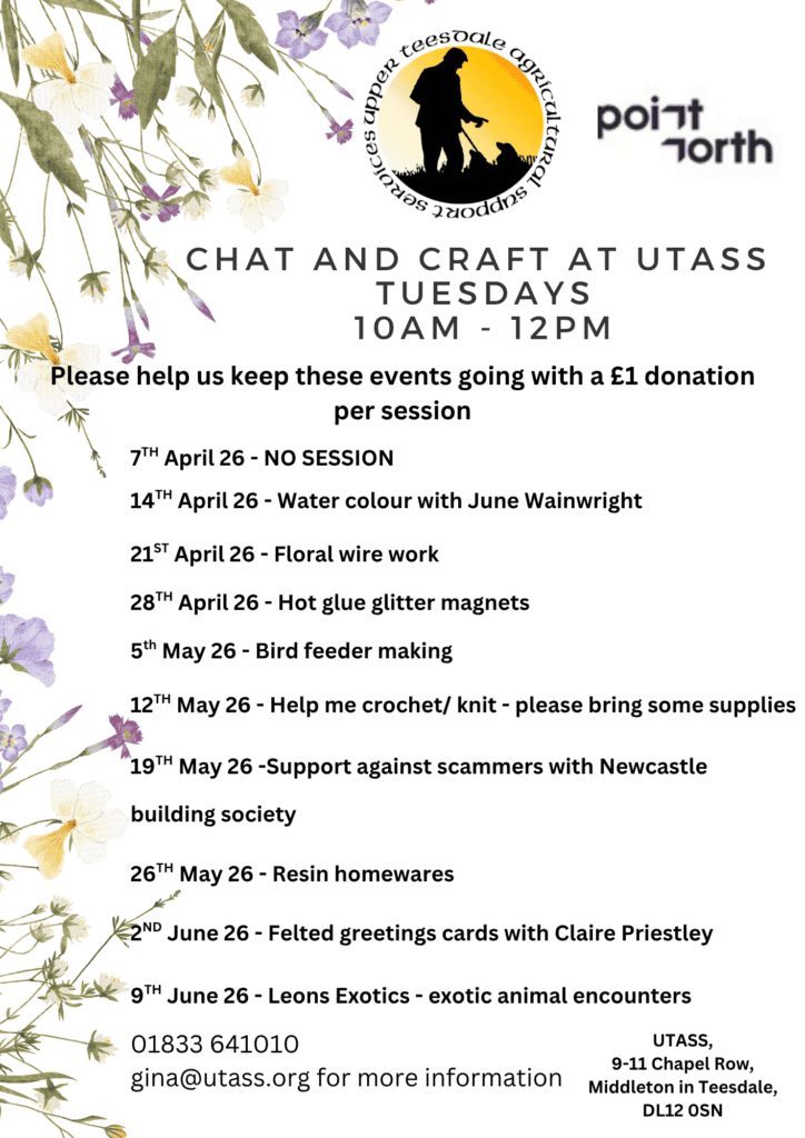 Come along and join in with our weekly chat and craft sessions. Every Tuesday 10am – 12pm at UTASS.